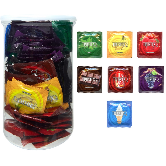 Pot de 100 préservatifs en latex à saveurs variés. Ces préservatifs en latex sont solides et durables avec un réservoir et lubrification pour le confort pendant les rapports sexuels. La meilleure partie est cependant la saveur délicieuse du pour une douce satisfaction orale! Ce préservatif aromatisé est le parfait accompagnement de rencontres spontanées avec votre partenaire ajoutant une touche savoureuse supplémentaire au sexe oral. Les préservatifs aromatisés vous permettent de pimenter des objets tout en vous protégeant. Grandeur: 190mm en longueur et 52mm en largeur.