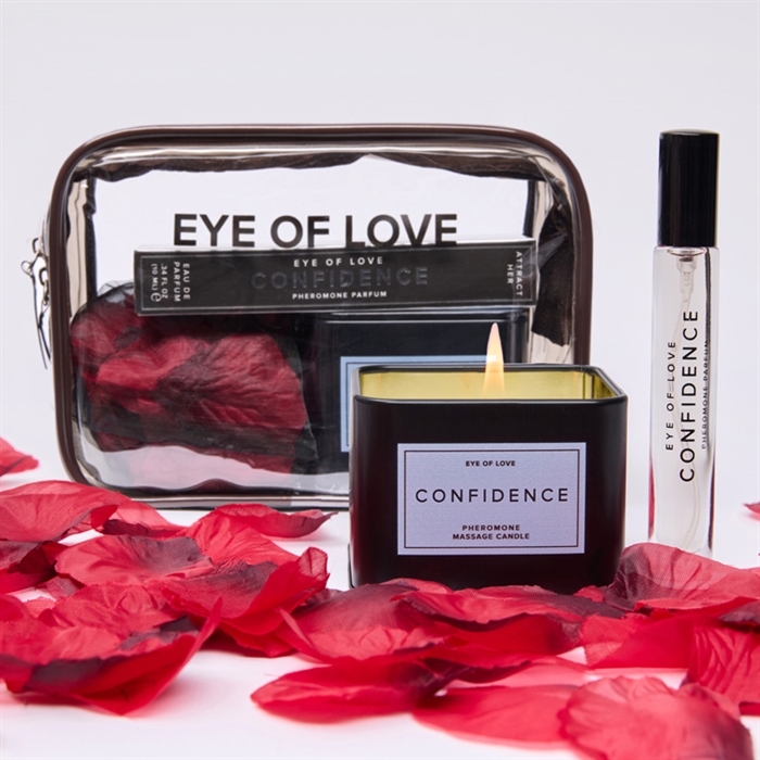 L'ensemble comprend :- Confidence Bougie de massage aux phéromones- 10ml de parfum de phéromone Confidence- Pétales de rose sensuels- Sac de voyage chic