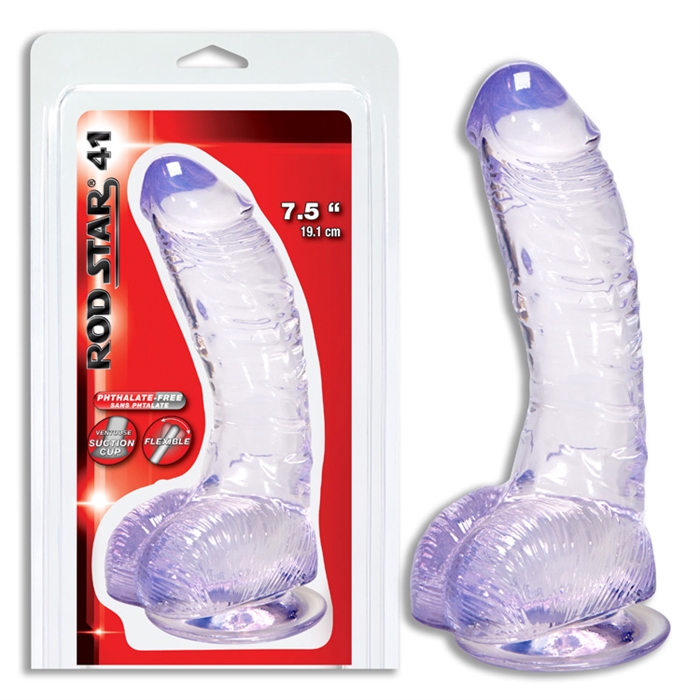 Rod Star® 41, flexible, doux, durable, des années de bonheur et de bon fonctionnement. Sans phtalate ni latex et sans odeur, il est doux et sécuritaire pour votre peau. Assurez-vous d’avoir un authentique produit Rod Star®; pour la qualité, la fiabilité,la sécurité, le confort et votre entière satisfaction. Il a une longueur totale de 7.5" (19cm), un diamètre de 1.6’’ (4 cm) ainsi qu’une ventouse à sa base. Un modèle translucide clair, courbé pour plus de sensations et une bonne paire de testicules.