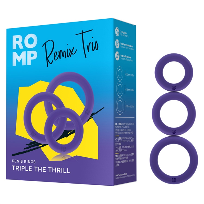 ROMP Remix Trio propose une sélection de trois anneaux péniens durables, super extensibles et non vibrants pour favoriser une érection plus forte et plus durable. Conçus pour s’adapter à toutes les tailles et à toutes les formes, vous pouvez en porter un, deux ou les trois dans différentes combinaisons pénis-testicules pour prendre du plaisir en solo ou en duo.